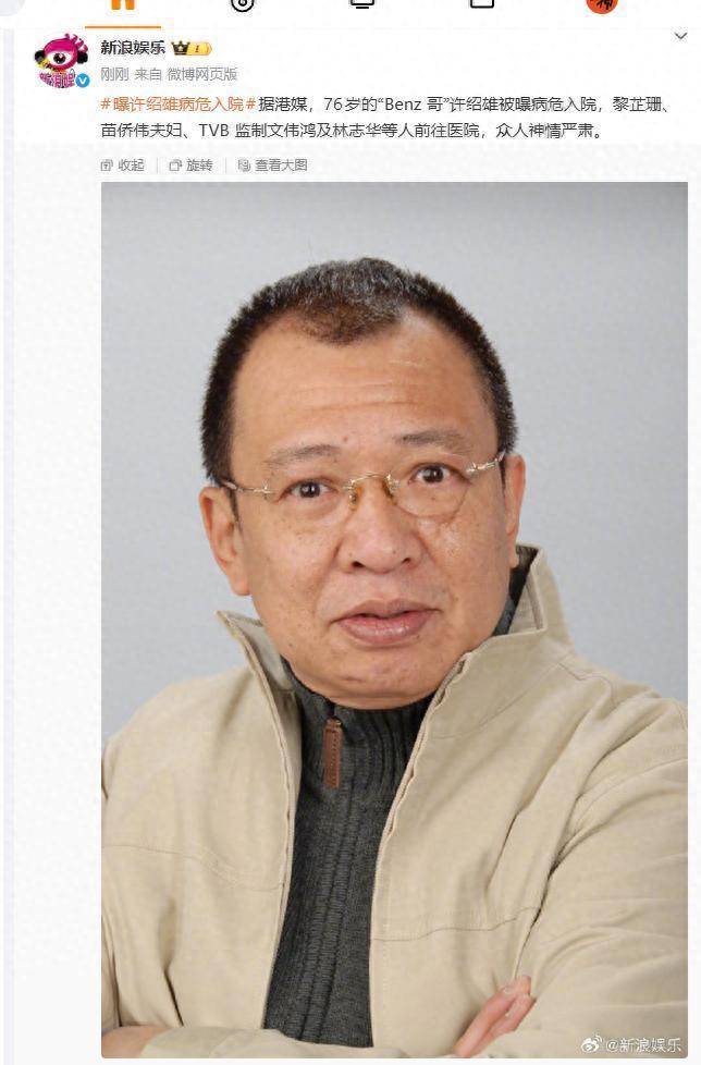 据港媒,76岁的“Benz 哥”许绍雄被曝病危入院,黎芷珊、苗侨伟夫妇、TVB 监制文伟鸿及林志华等人前往医院,众人神情严肃。